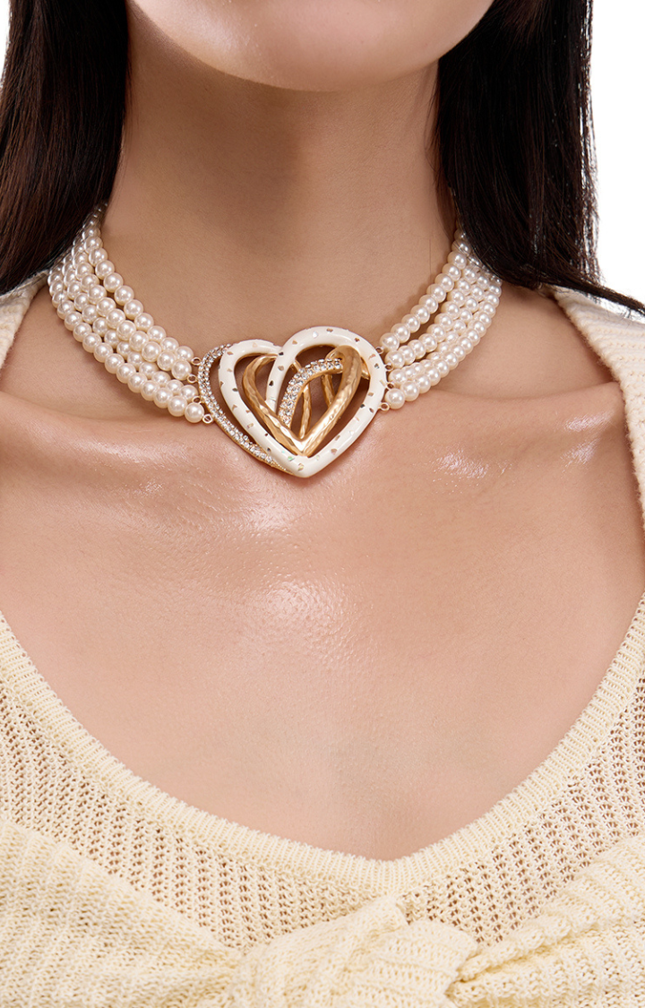 LOCKED IN PEARLS MULTI-LAYER HEART CHOKER