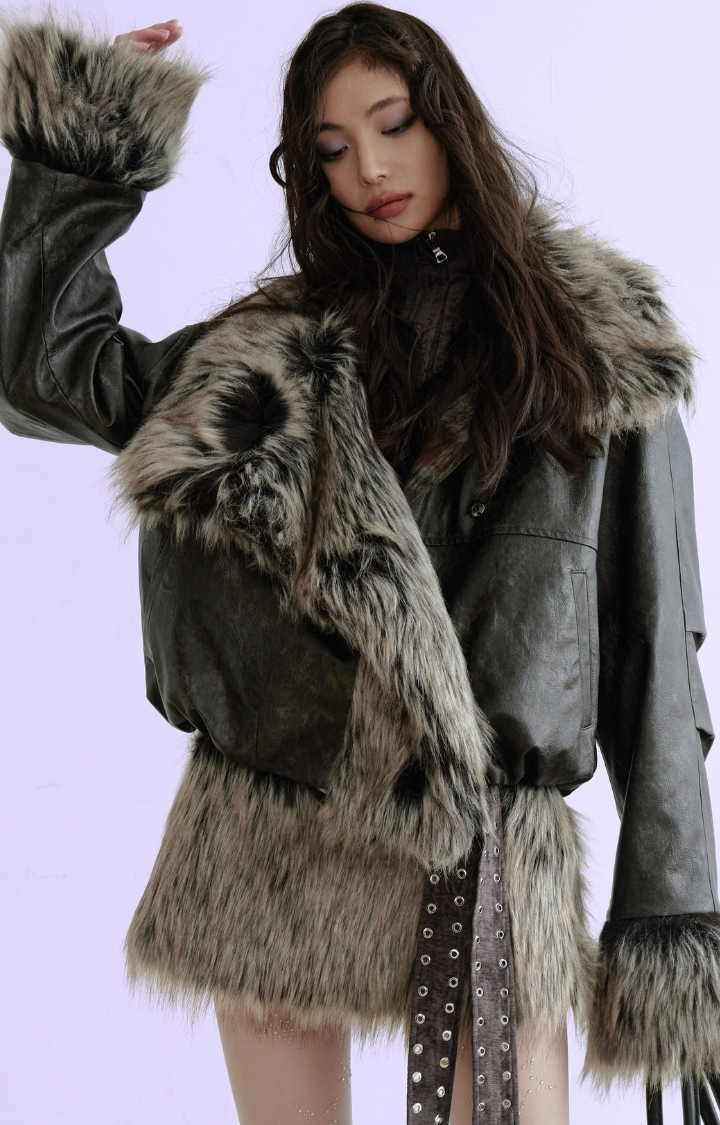 SIBERIAN CHIC DETACHABLE FAUX FUR COLLAR LEATHER JACKET